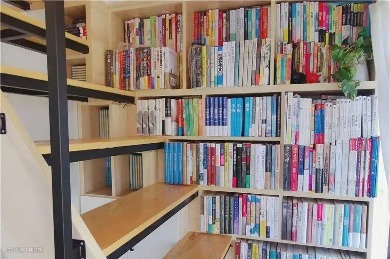 ▲阳台,一侧开放式书架+楼梯的设计,拿书看书很方便。楼底下方设计成了收纳空间,家里囤的日用品和各种工具都收纳于此。