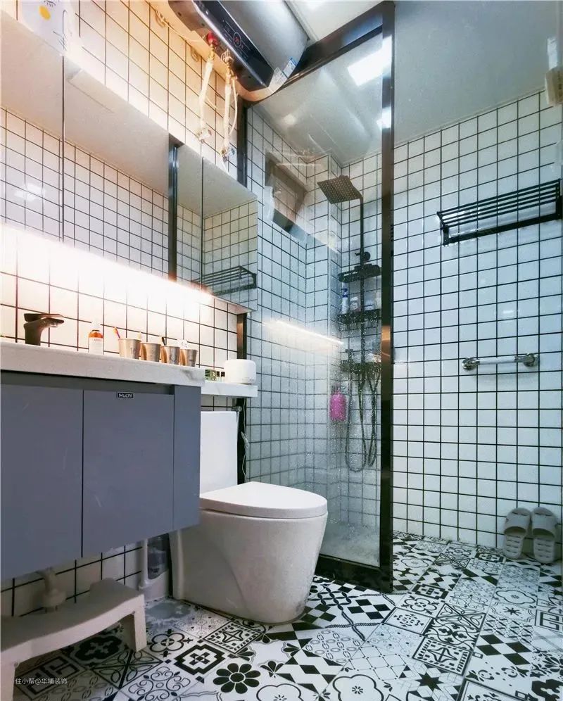 ▲卫生间是个没有窗的暗卫,采用了白色小方砖+花色地砖,显得通透明亮。淋浴区与马桶之间安装玻璃隔断,做干湿分离设计,干净清爽。