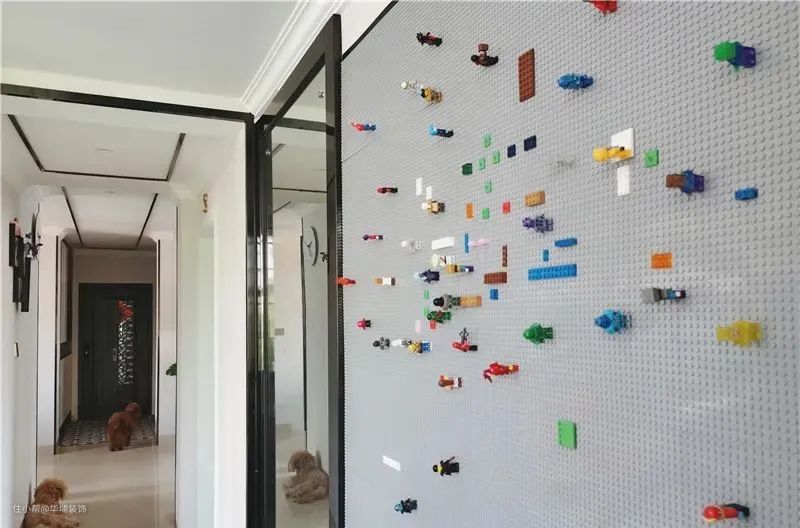 ▲入户过道式玄关,在进门右手边定制入墙式鞋柜,既大大增加了收纳功能,还不占用空间。进门左手边摆放橙色换鞋凳,并用装饰画遮挡配电箱,颜值杠杠的。
