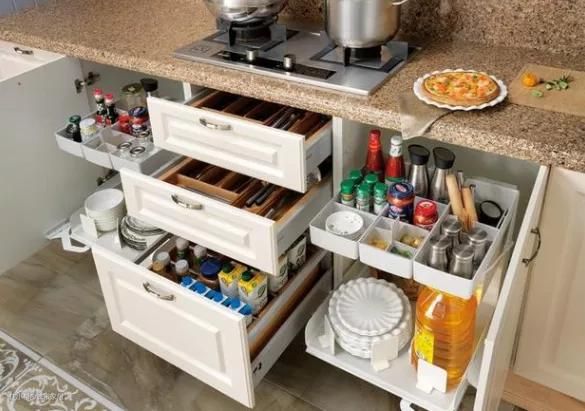 根据活动路线来收纳,遵循“上轻,中常用,下重”的原则 ,这样收纳不仅拿取方便,而且也保证厨房储物柜的使用寿命和安全性更高。
