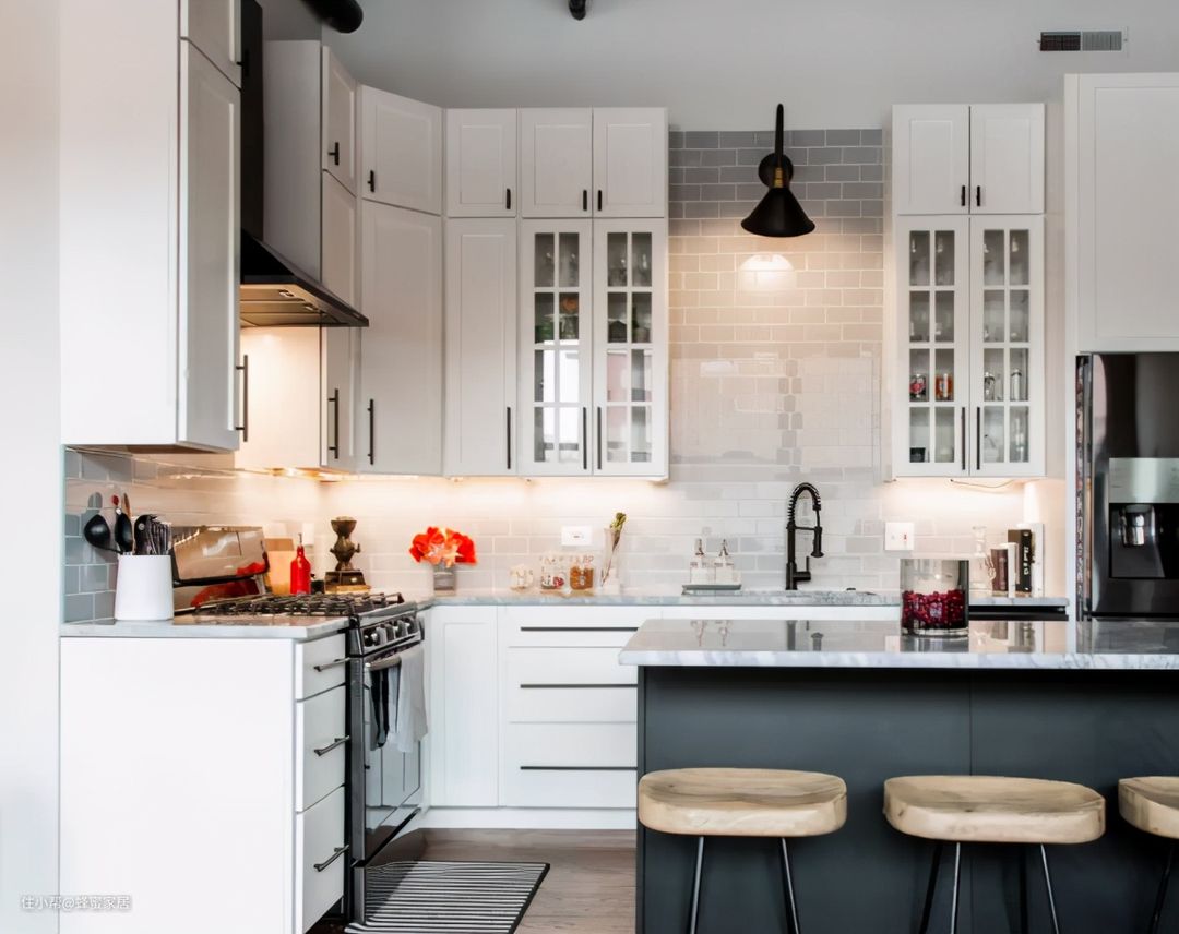 收纳要遵守“二八原则”指的是露二藏八,把锅碗瓢盆,餐具刀叉,常用和不常用的大小件物品都做好规整收纳,只把油盐调料和烹饪厨具等悬挂出来,厨房空间会变得更整洁。