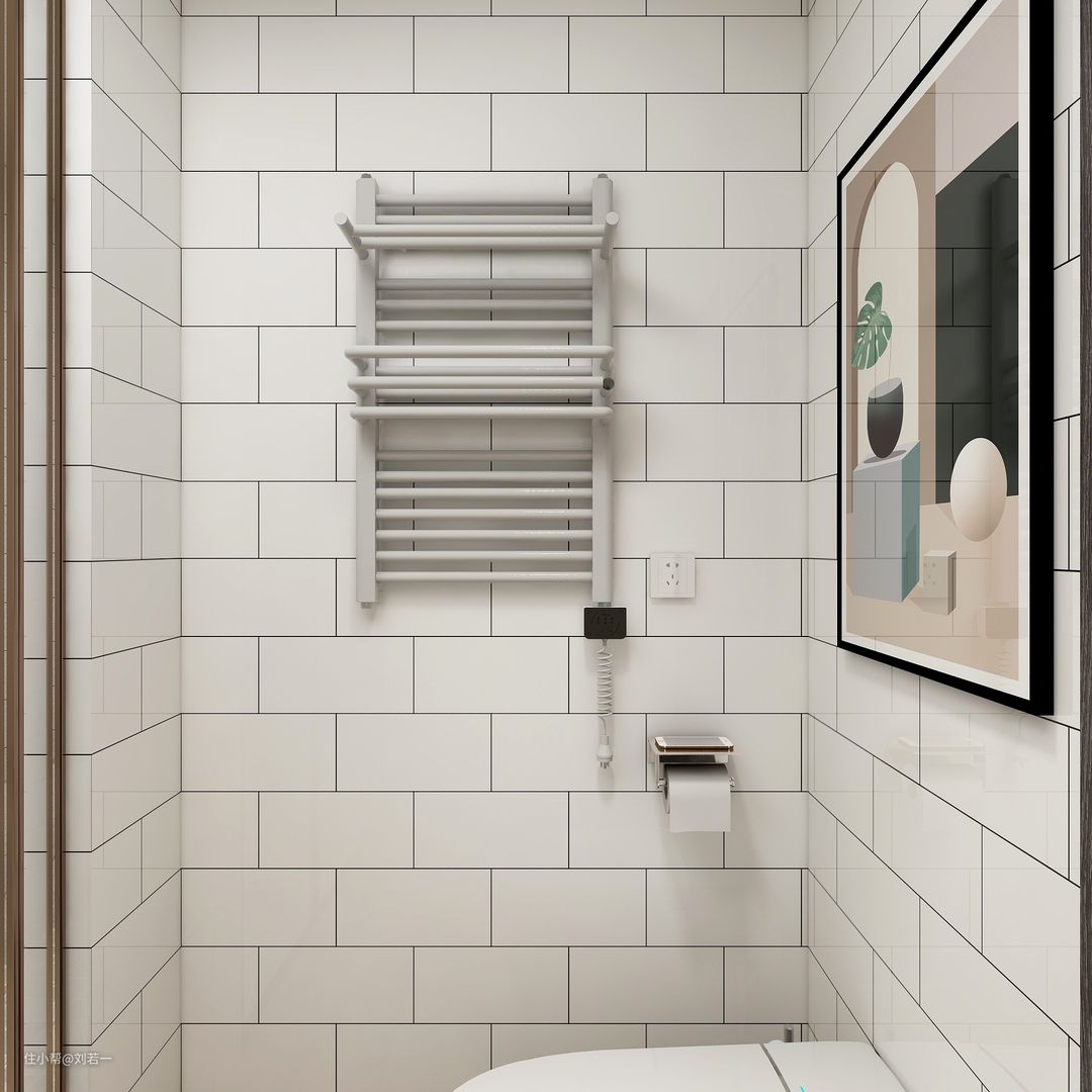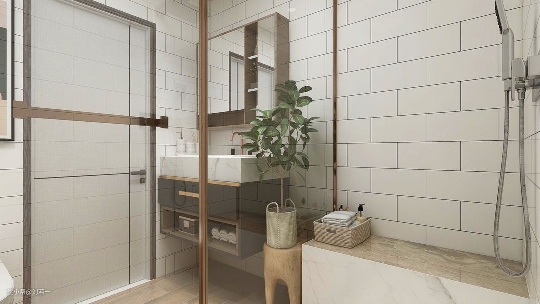 墙面白色瓷砖和金属配件的灯饰让家里的空间显得独特又精致,看着不会单调,整体的视觉和冲击感也比纯色的大理石要强很多。地面铺的是用浅色的实木地板,与淋浴房的金属门框和射灯相衬托,使视觉效果更加美观。
