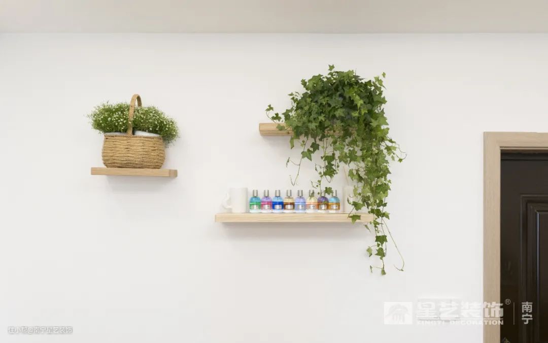 木色缺少不了绿植与小摆件的搭配,一小盆绿萝、满天星,就让整个空间弥漫着清新自然,生意盎然的气息。