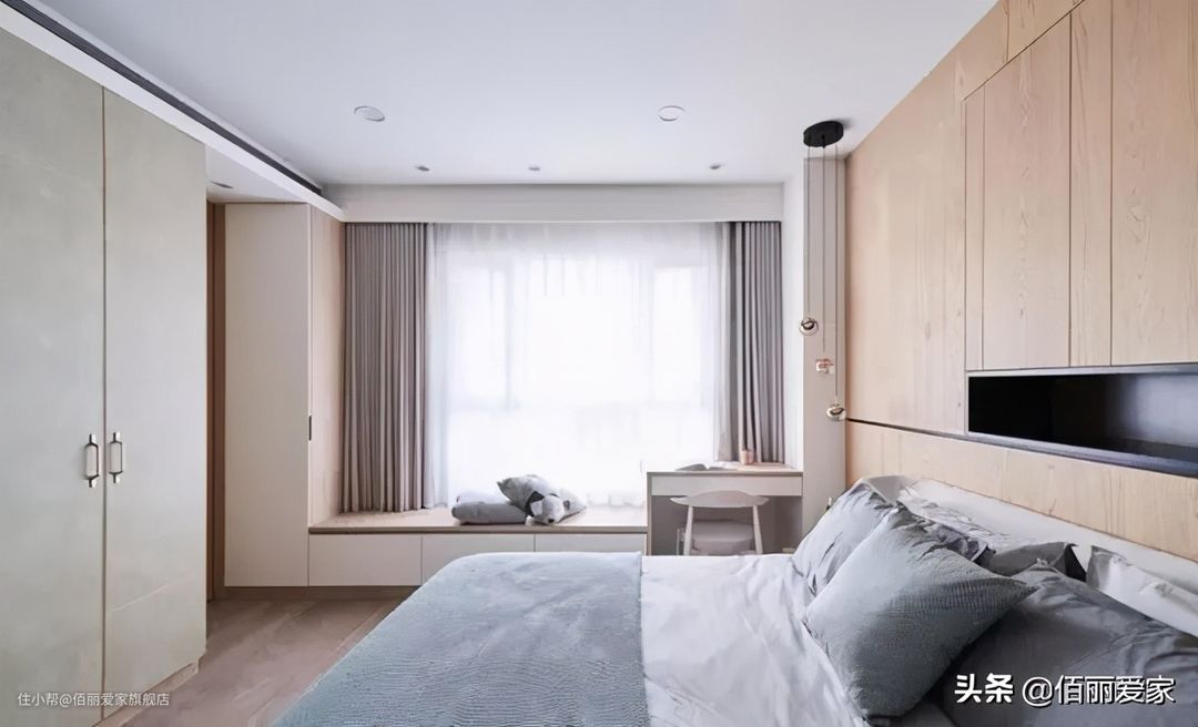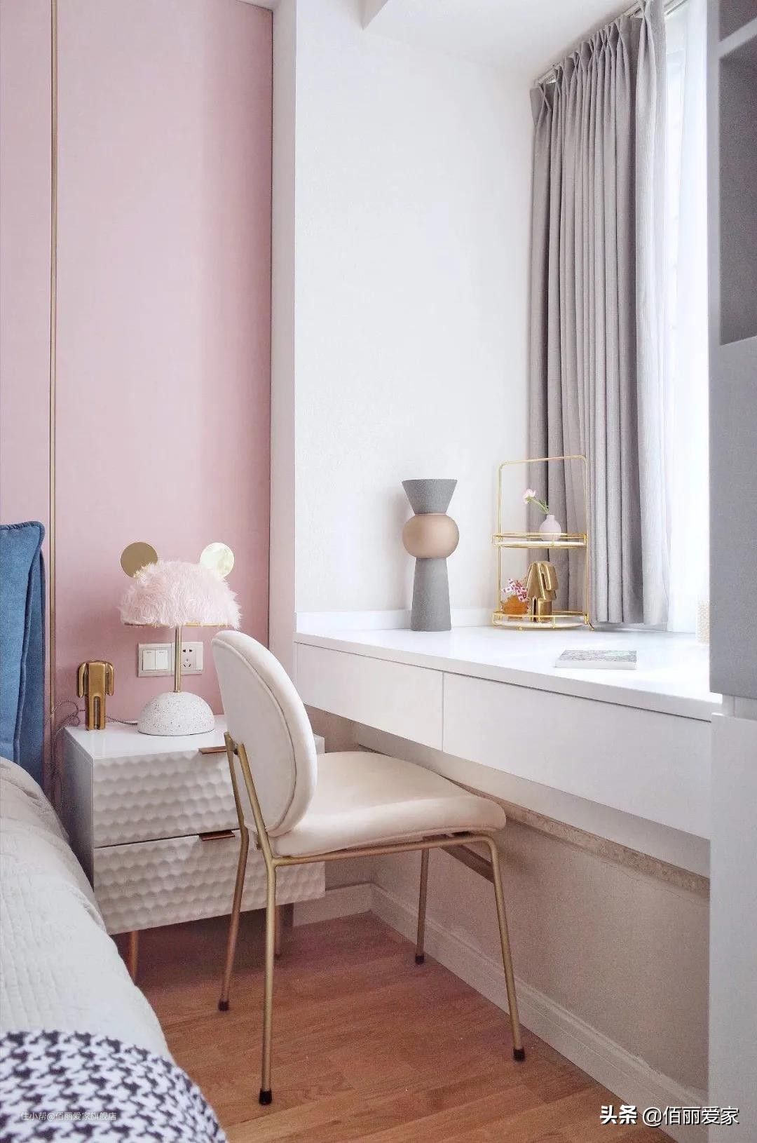将飘窗与梳妆台进行交替设计,可以加宽梳妆台的台面,使用更舒心。