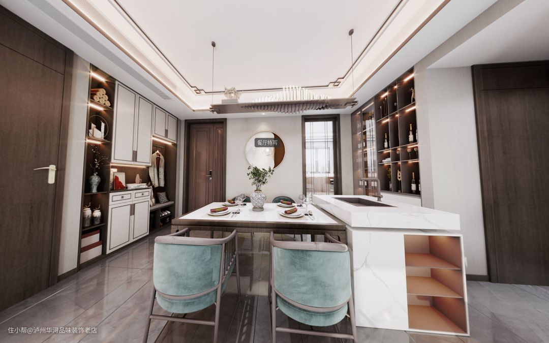 设计理念:本案是泸州知名广告公司的老总,他是泸州人都很喜欢的一个广告公司,所以人员也比较好,设计师也愿意去帮着设计,这套案例通过与业主交流,下来发现业主是比较怀旧的一个人,所以风格上面要求是新中式风格,由于空间原因,户型的缺点等原因,所以设计上面还是很不容易,第一点就是餐厅设计,餐厅很不好处理,所以设计了岛台链接餐厅,让空间更实用。