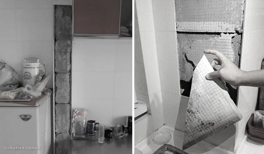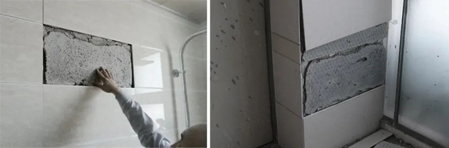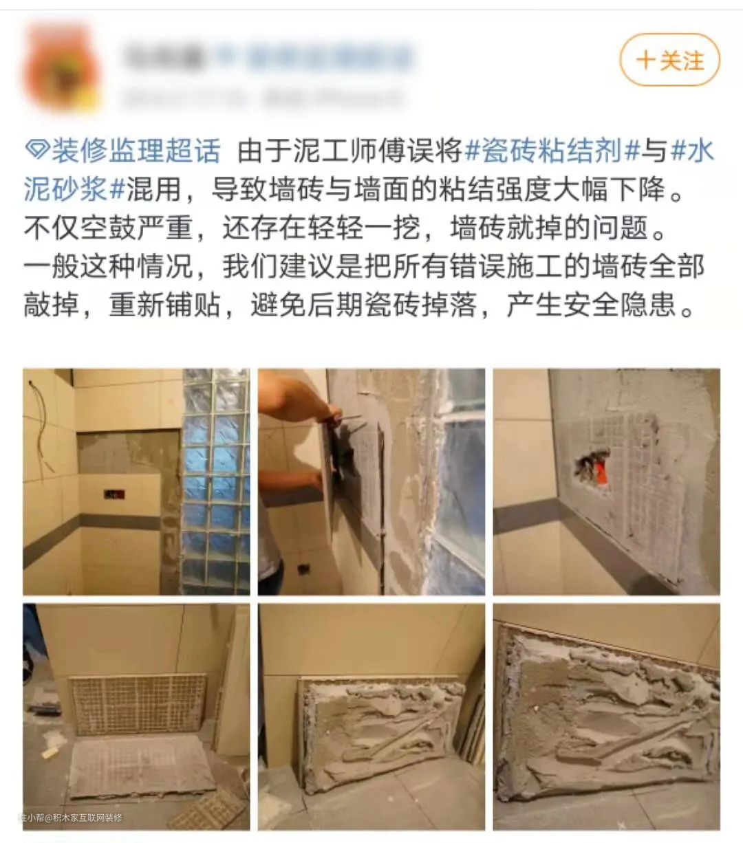 瓦工师傅错把瓷砖粘合剂和水泥砂浆混用,导致墙砖与墙面粘合度降低。墙砖不仅空鼓,还一碰就掉,给业主埋下了隐患......