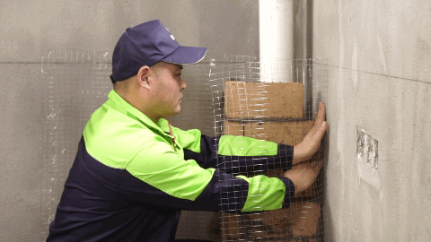 在贴砖前,还要在墙面铺贴一层防脱挂钢丝网,可不要小看这层网的作用,它能像个双面胶一样贴紧墙面和瓷砖;它还可以分摊瓷砖对烟道的拉力,防止烟道拉裂;