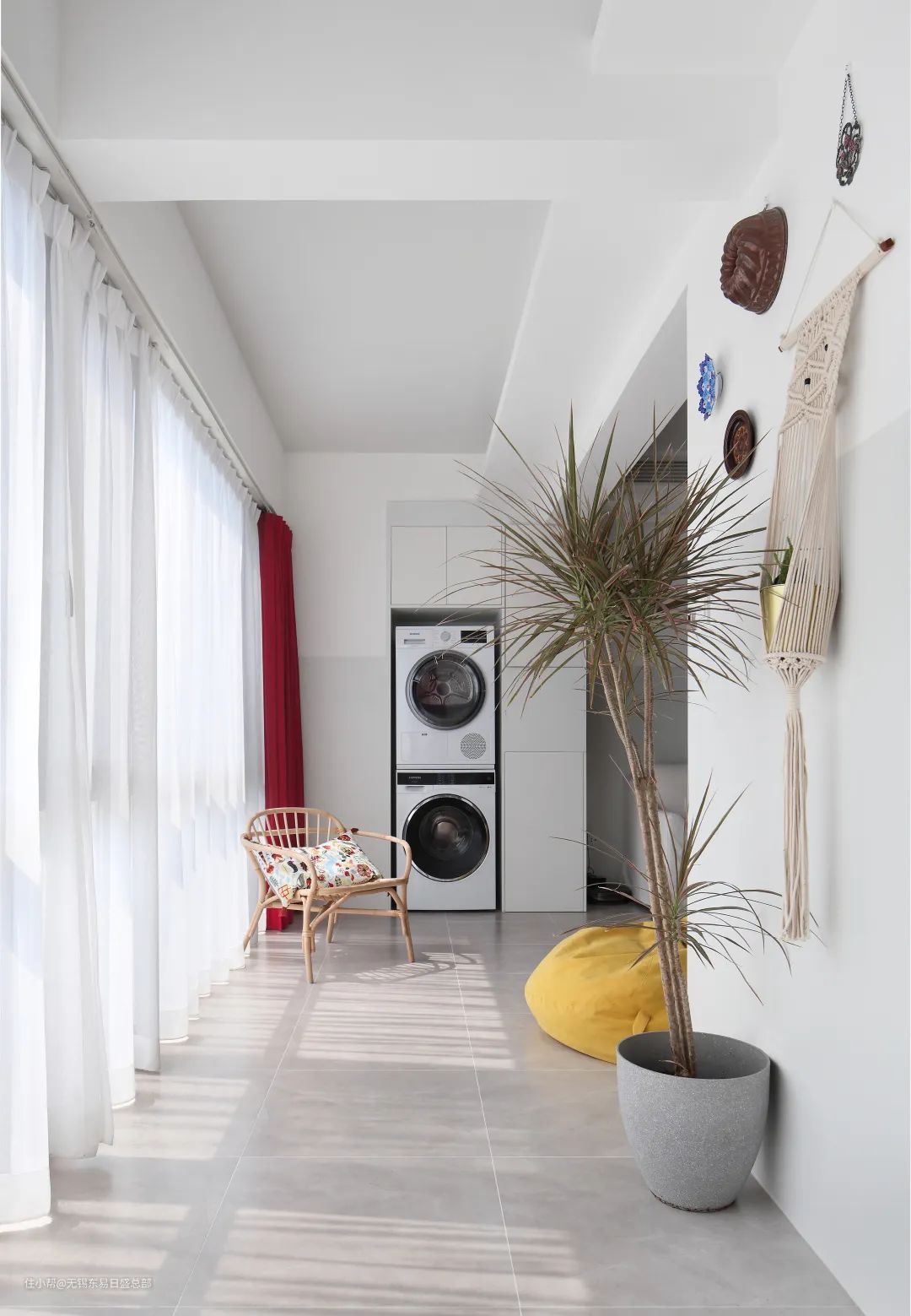 如何解决衣服的晾晒问题?有条件的话可以选择烘干机,在摆放洗衣机的地方定制一款储物柜,把洗衣机、烘干机嵌入,柜体上面用来储物,既增加了收纳空间,又美观、实用。