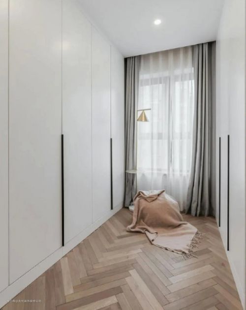 步入式衣帽间以原木地板铺设出人字形,与白色衣柜、灰色窗帘搭配出沉静,灯光融入温馨的味道,增加了衣帽间的颜值,也格外实用。