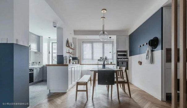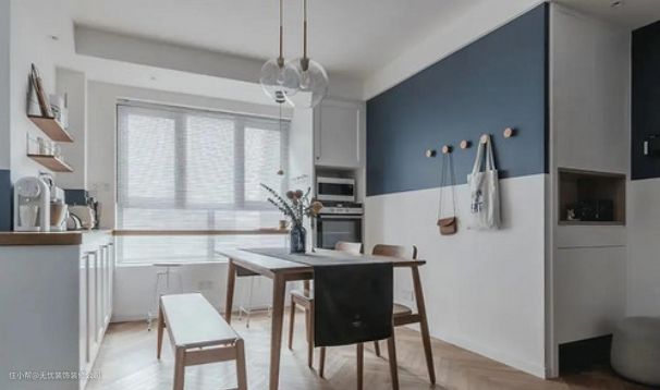 设计师对本就不大的小厨房做了半开放式设计,增加了空间的采光,为女主人在餐厅烘焙和看书提供了空间,增强了两者之间的互动和交流,增强了空间收纳的美感。