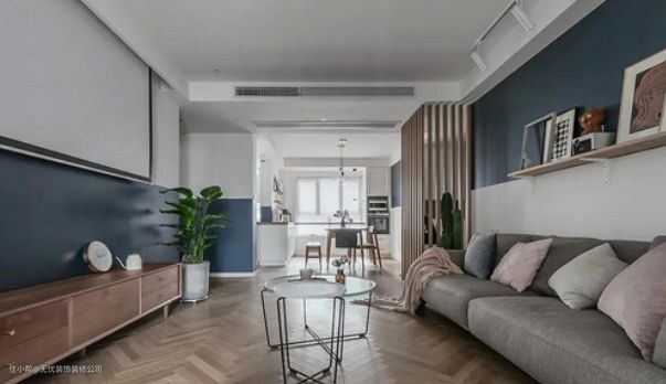 这是三居室装修,建筑面积125m,空间设计崇尚“阳光与生活”。因此,餐厅的设计增强了整个空间的采光,绿色植物摆放在每个角落,使家居充满活力。结合人字木地板,既凸显造型的美感,又营造出北欧的自然意境,非常简约温馨;虽然空间整体颜色略显冰冷,但灰色的软装搭配一点点粉色,让生活更加温柔,而蓝白之间流淌的优雅则体现了家的舒适;当你走进每一个空间,都会发现不一样的东西。而设计师通过一些相同的元素将空间的主旋律串联起来,比如蓝白拼接的墙面、个性化的灯光、家具,每一个细节处理都突出了主人的生活情趣,记录着自己的生活幸福。