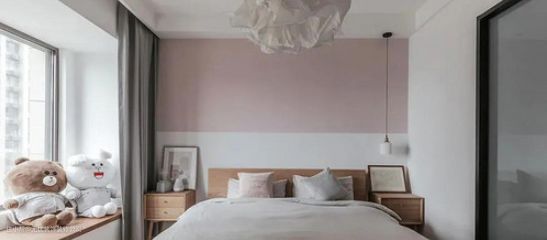 卧室的线条十分简单,可以说以功能为主,背景墙以烟粉勾勒一抹浪漫韵味与纯白色拼接整体轻盈而优雅,北欧木纸床头柜的温质,营造一种温馨,与摆饰和灯饰,造就空间美学。