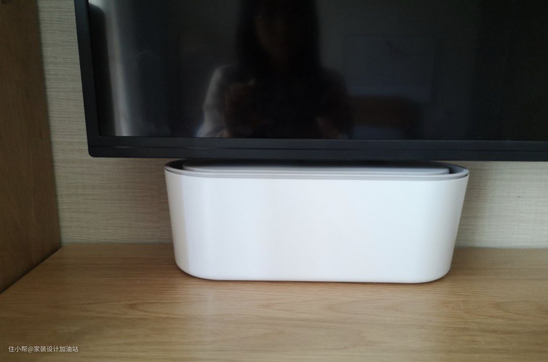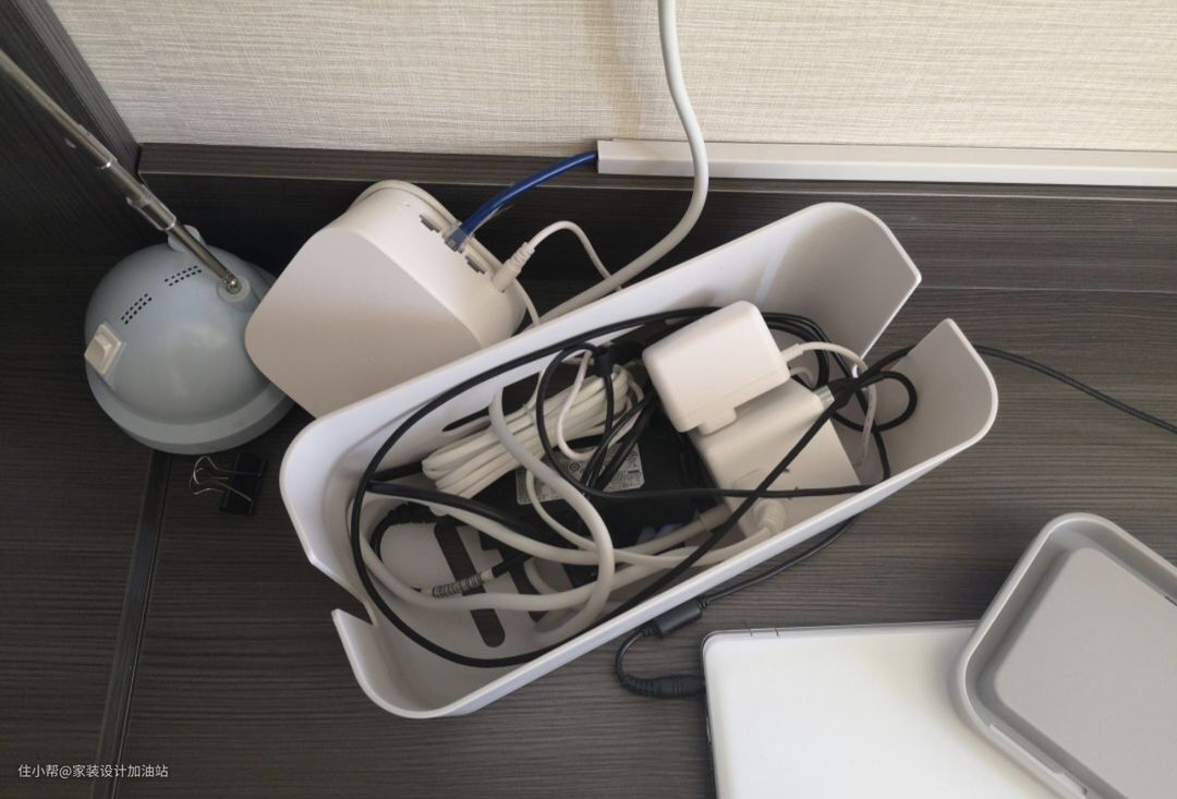 盖上盖子后,也比较整洁,而且选择插线板收纳盒的时候,建议一定选择两侧都开孔的。