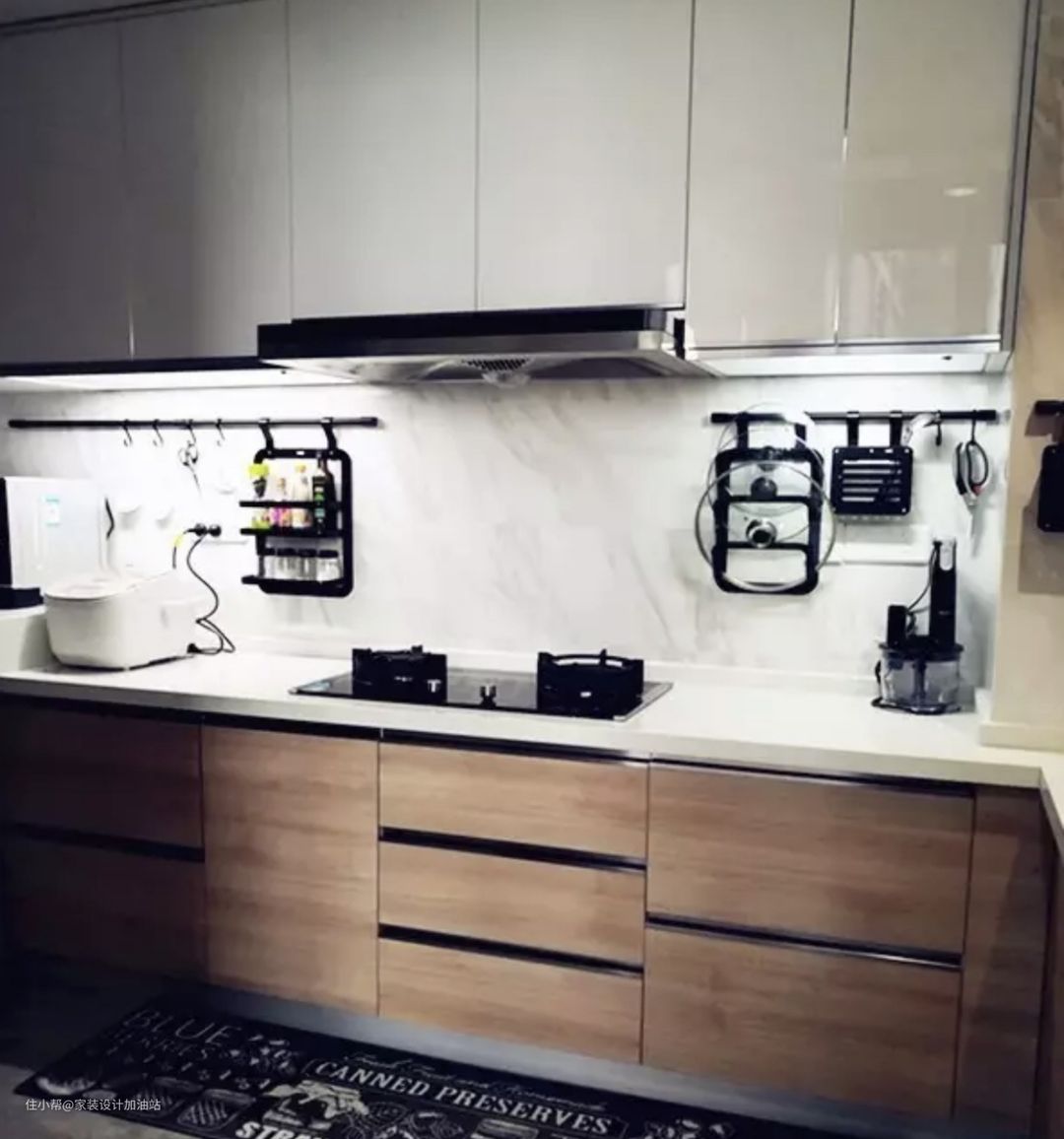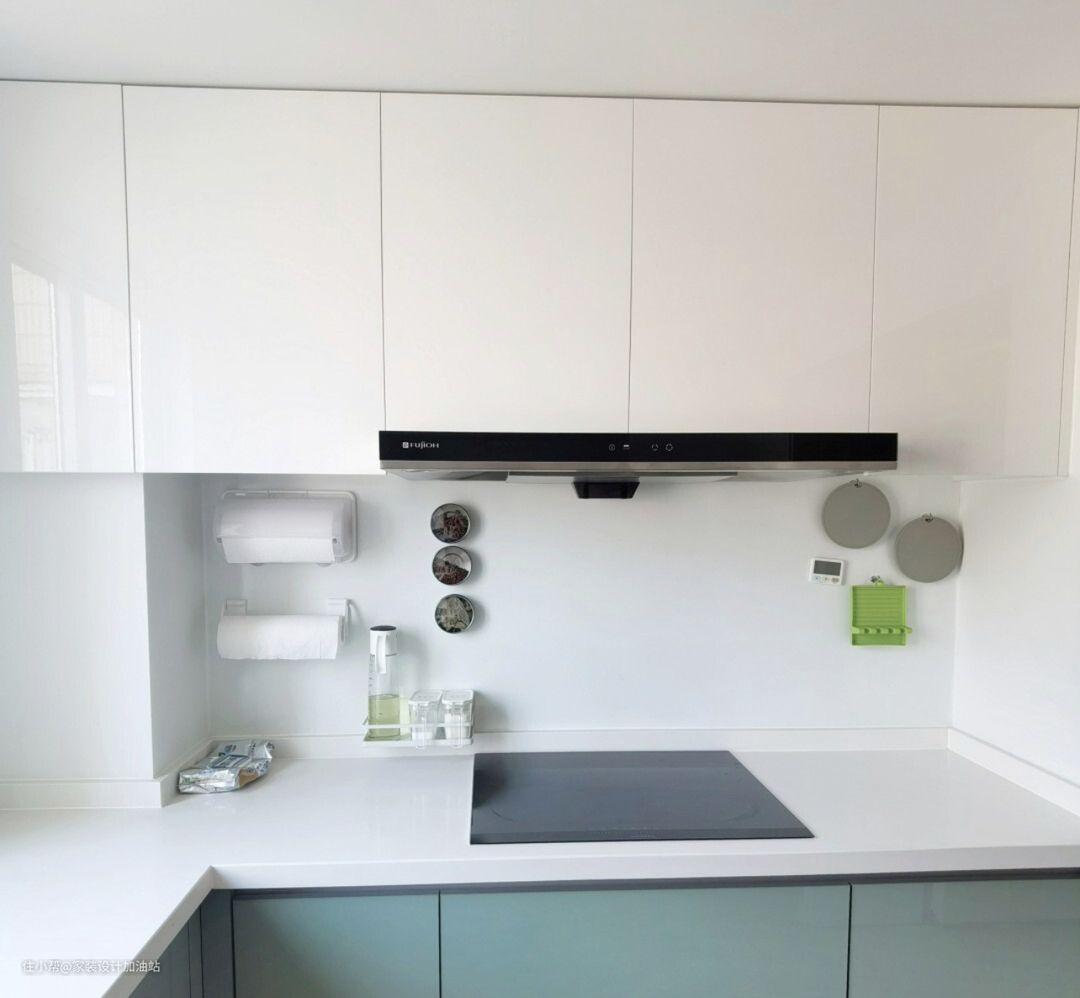 日式装修,更喜欢在灶台前使用珐琅板,是一种防油耐高温的搪瓷钢板,表面完全无缝隙,又十分光滑。