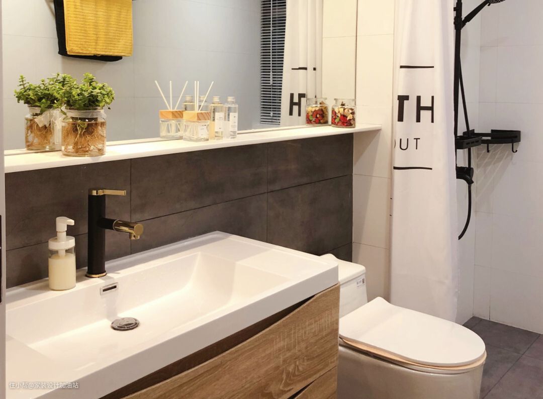 不过,卫生间的洗漱台记得加前挡水条,洗脸、洗衣服的时候,能减少弄湿地面,也就不用经常拖地了。