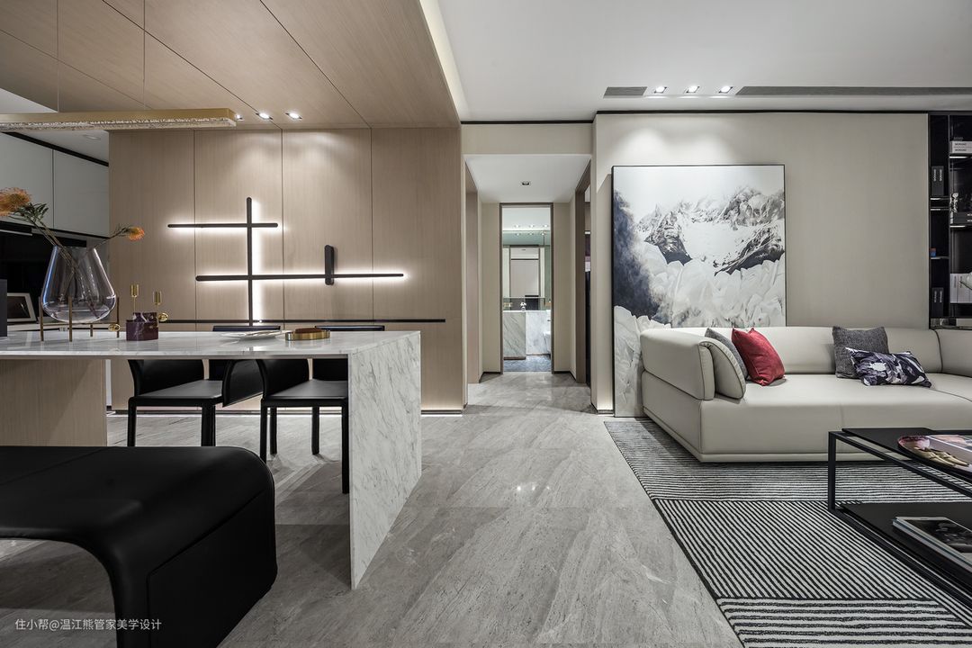 现在很多家庭都会选用亚白色瓷砖进行客厅装修,因为亚白色象征着干净、整洁、大气,而且亚白色是个百搭色,可以搭配的颜色非常多。