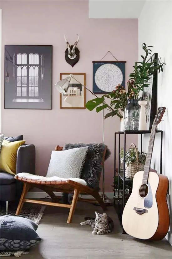 烟灰粉色的饱和度很低,一般用来大面积铺陈于家居空间,与纯白、高级黑等色调搭配,会比少女粉还要有质感。整个空间气质也更柔和优雅。