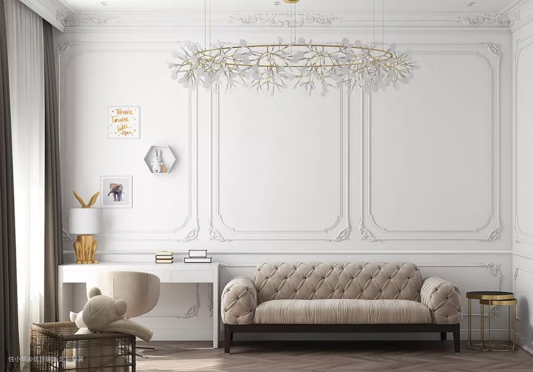 在偏古典、轻奢风格的室内,踢脚线与细细的石膏线结合几乎是标配。这种组合方式可以让墙面更有立体感。