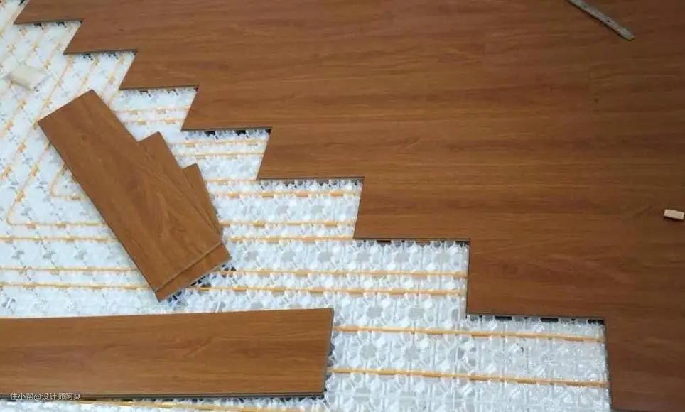 ▲不打龙骨,地面找平后铺PE膜和防潮棉,再安装地板