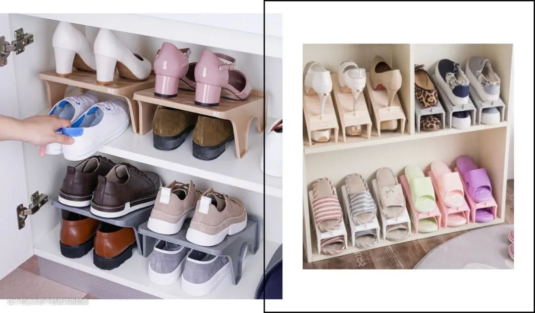 如果不方便安装活动层板,也可以选择自助鞋架,比如这种立体式的上下鞋架,可以将鞋子上下叠放起来。少穿、非当季的放下面,常穿的放上面,轻松就增加两倍空间。