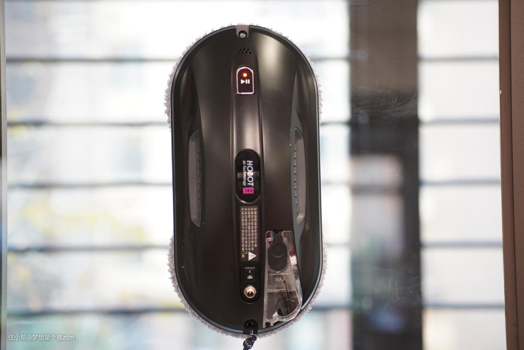 在外接电源插座的右侧有一个小巧的水箱,并且在水箱上设计了超声波喷雾装置,HOBOT 388玻妞擦窗机器人在工作的时候,可以通过超声波喷头向玻璃表面喷射出微米级别的水雾,水雾将玻璃表面的尘埃颗粒包裹凝结后,就能够被擦窗机器人更加轻松的擦除掉。