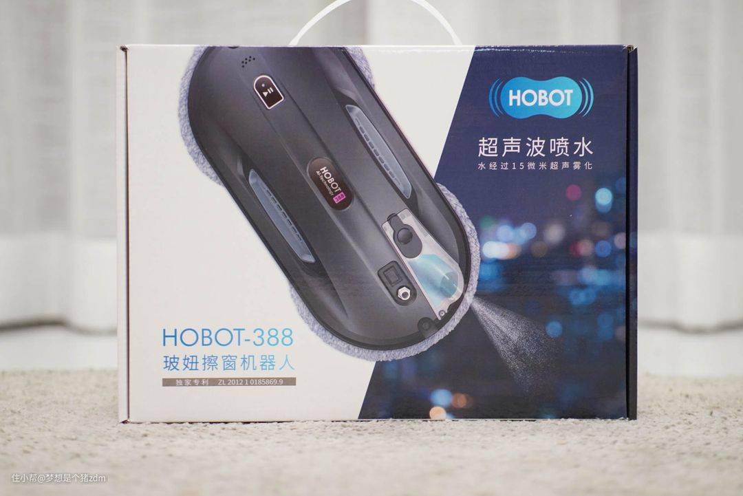 这是HOBOT 388玻妞擦窗机器人的包装盒,在包装盒右上角重点突出了这款擦窗机器人的超声波喷水技术。