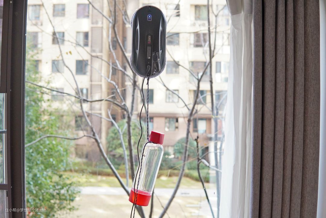 可能有些人还是担心这个擦窗机器人在玻璃上的吸附力不够而不小心掉下去,其实完全不需要有这种担心,我用水瓶装满了1.25L水后挂在擦窗机器人的安全绳下做了试验,擦窗机器人依然能够非常牢固的稳稳吸附在玻璃上,纹丝不动。