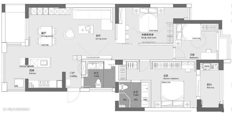 通过上面对户型的缺陷,设计师脑洞大开,深思构想,给出大家这样的平面布置和对户型的改造。