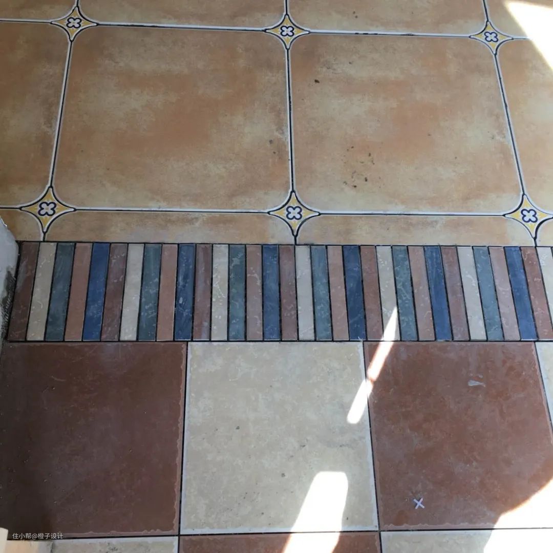 房门如果两边地面没有高度差,而且材质也是一样的话,也可以考虑运用彩色砖来做过渡,让空间显得更加活力跳跃,比如美式风格、田园风格中,就经常看到马赛克、彩色砖等比较显眼的门槛石设计。