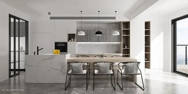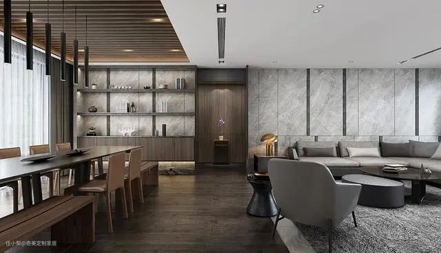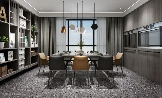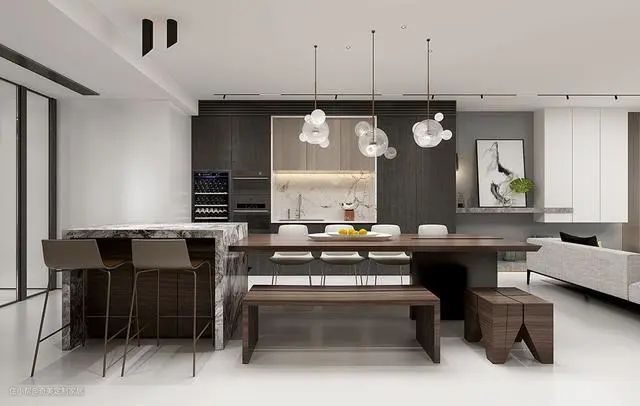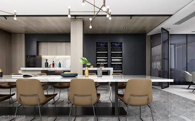 餐厅代表了一个家的温度,是家中很重要的场所,一家人晚上坐在一起吃饭、聊天,忙碌一天的辛苦在温馨舒适的家中自然得到释放,家人一起围在餐桌旁闲聊琐碎的日常,享受美妙时光。