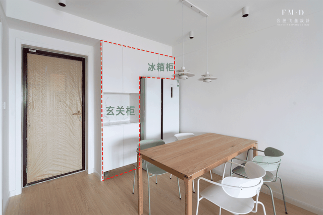 由原本玄关的墙面,先延伸出冰箱柜,再延伸出一体式餐桌,连为一排足足有4米2长,把小户型也打造留出大宅的入户感。