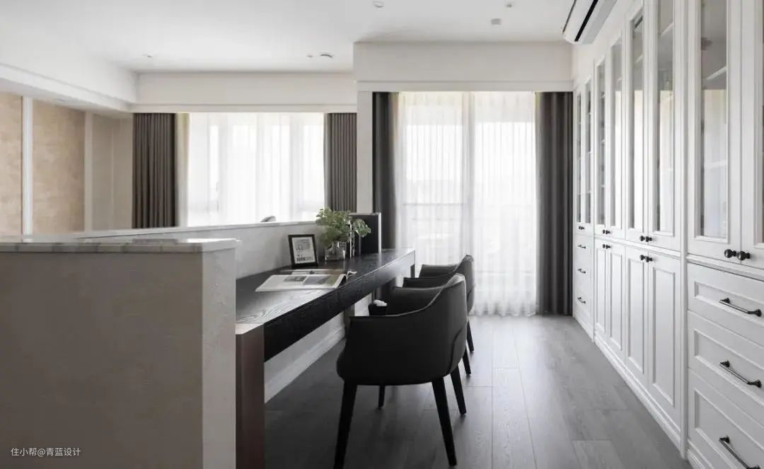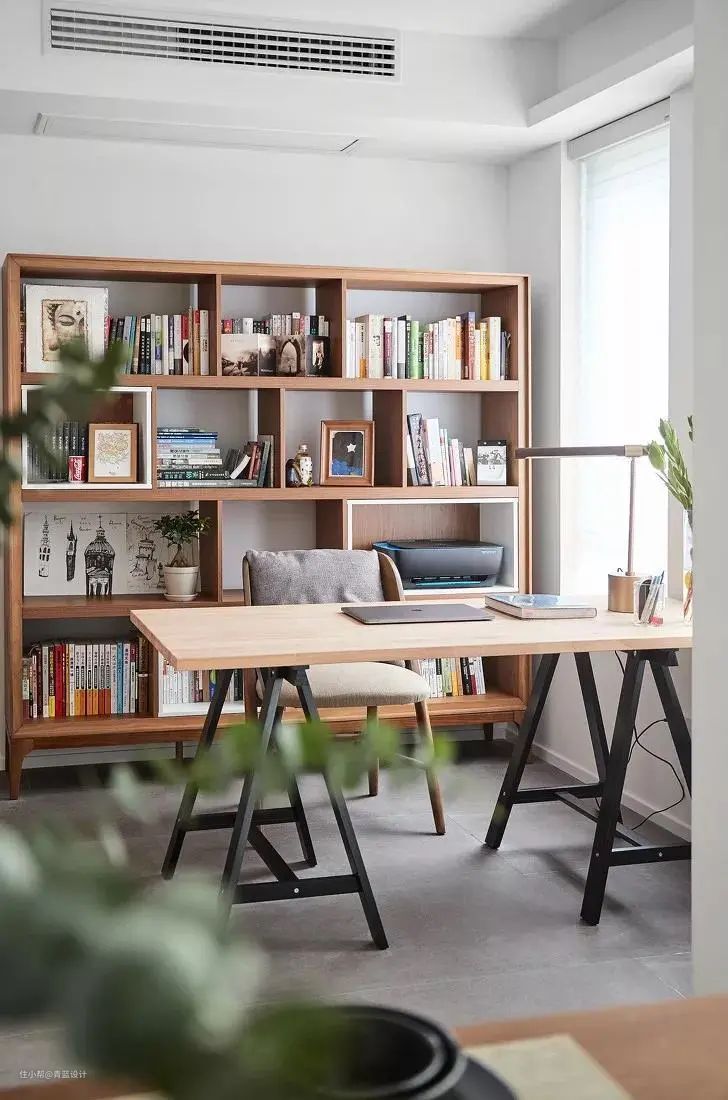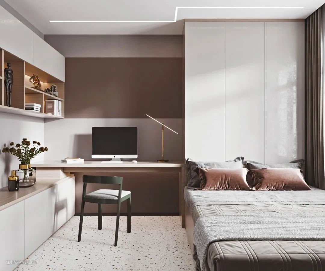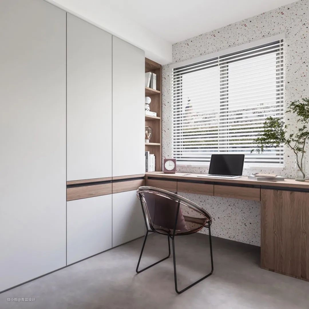 其实呢,也可以利用其他的空间打造成多功能的书房,例如书桌+收纳柜+储物间的形式,不仅能满足日常的办公需求,也能满足更多的储物需求,也可以把书放进柜子里,平时不用的时候就拉上门,美观又实用!
