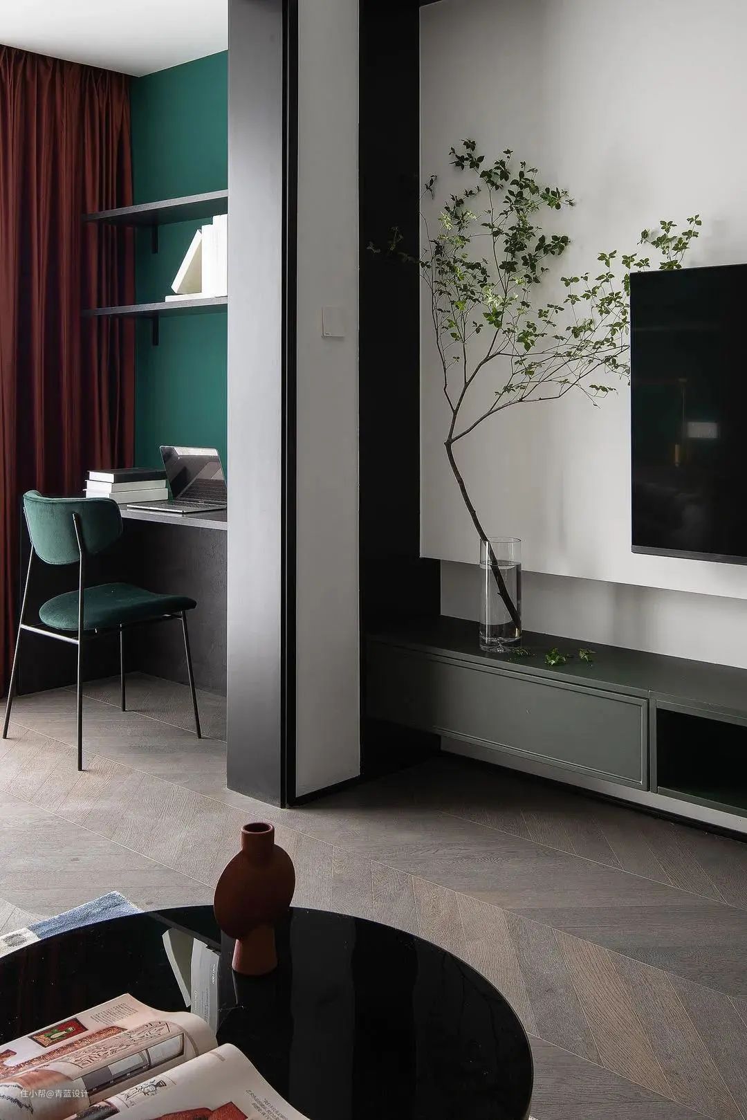 在客厅的一角设计一个简单的书房,又是两个独立的空间,搭配书柜灰常的节省空间~