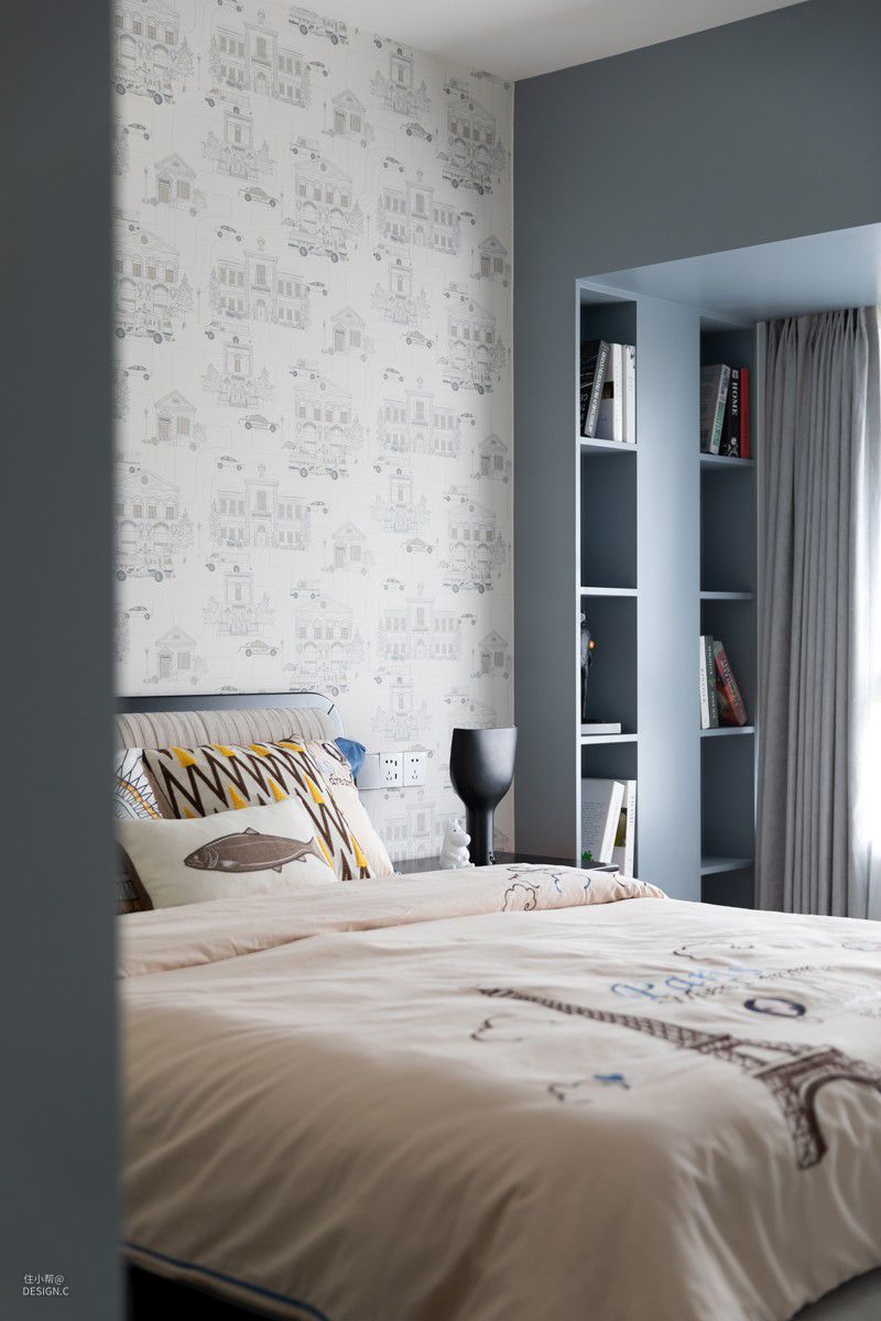 儿童房非一味的童真符号填充,蓝色基调+少量亮色,浅淡的图案壁纸、几何拼接的多色地毯, 把控童趣尺度,具有较长的成长空间氛围。