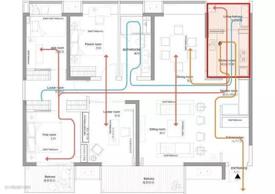 1、家里有客人到访,一般情况下产生的动线是从客厅-餐厅-卫生间。这条动线比较开阔、公开,与卧室等私密空间应避免相交。