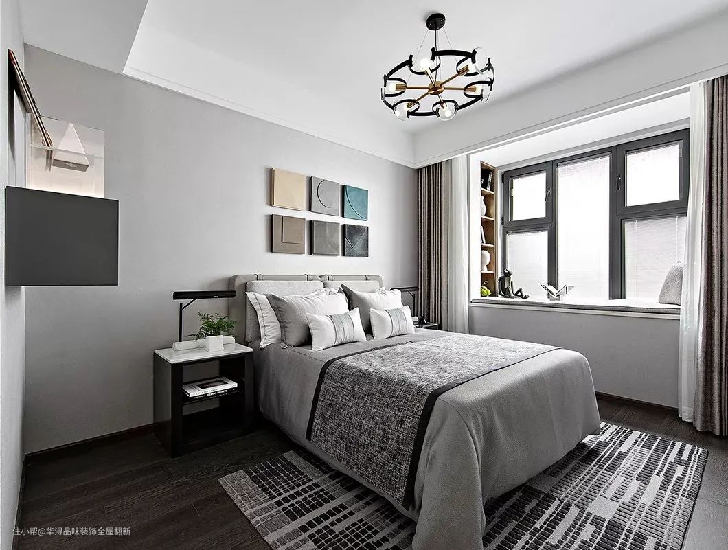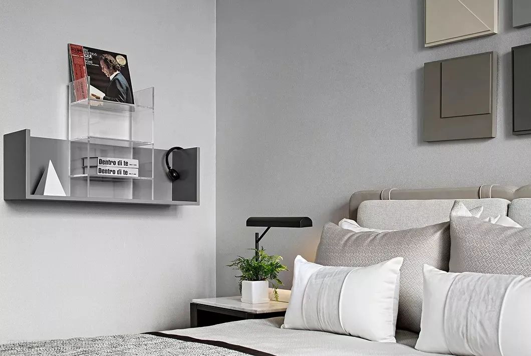 ▲次卧在浅灰色的空间基础,床头墙挂上一组方形的装饰画,这组画的颜色与线条个个都不同,搭配皮艺的床铺,灰色简约的床单,左侧黑色柜体+白色台面的床头柜,整个空间显得简约舒适而高级端庄。