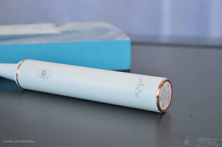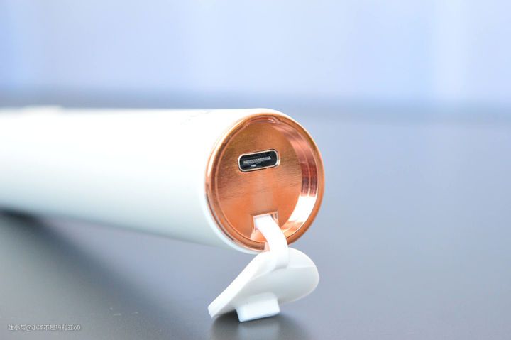 素诺这款智能洁牙仪采用了比较流行的白色极简设计,在顶部和底部使用了玫瑰金色的金属圆环进行点缀,整体造型简洁干练,外形上跟我的电动牙刷十分相似,握在手中感觉十分轻巧,不会带来过多负重感。