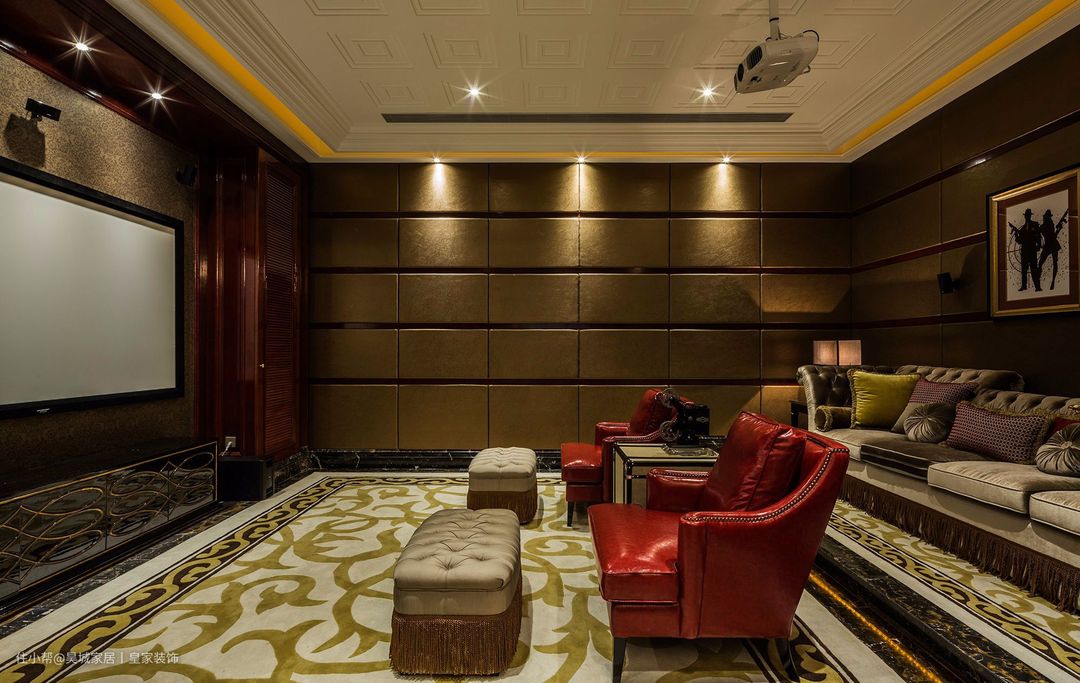 欧式花纹的地面给视觉带来了强烈的冲击感,由于用途的特殊性,视听室的墙面还运用隔音板做了隔音处理;精心挑选的观影座椅依地面高矮有序摆放,保证每个人都有一个好的的观影体验。