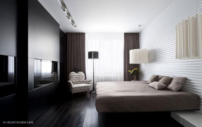 家庭黑白灰背景墙效果图五:卧室也可采用黑白灰来装修,白色床头背景墙与深灰色电视背景墙相对应,鲜明的色彩反差带给人强烈的视觉冲击感。内嵌黑色电视,在深色地板的映衬下更显沉稳低调。