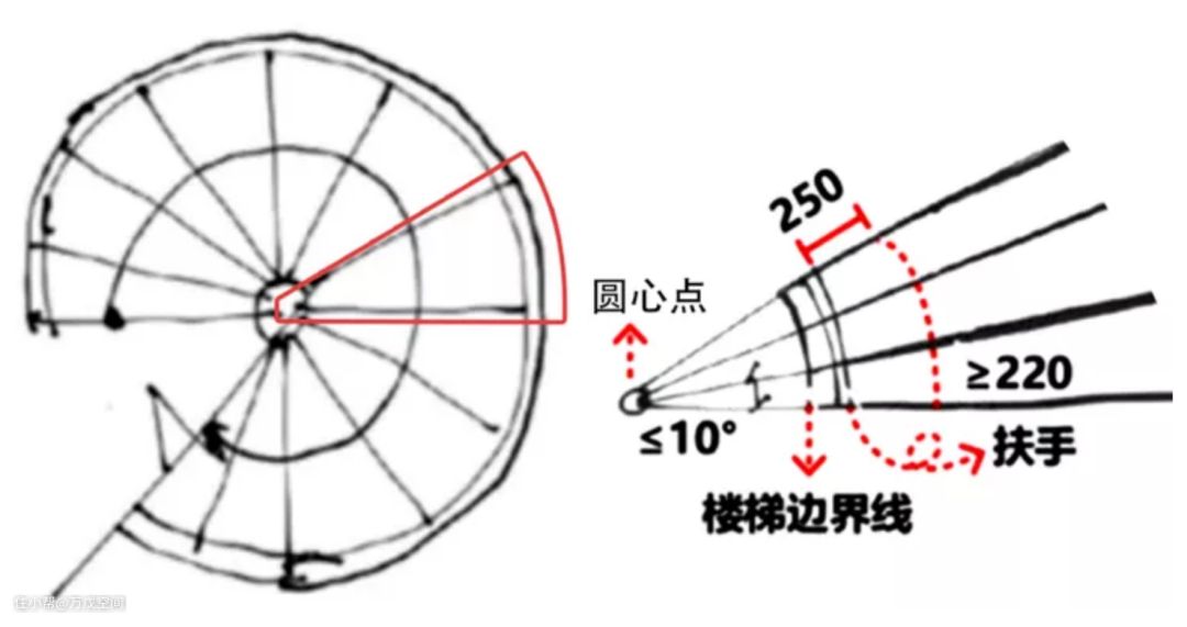 弧形楼梯、扇形楼梯作为疏散楼梯时,踏步上下两级所形成的平面角度不应大于10°,且每级离扶手250mm处的踏步深度不应小于220mm,如上图所示。