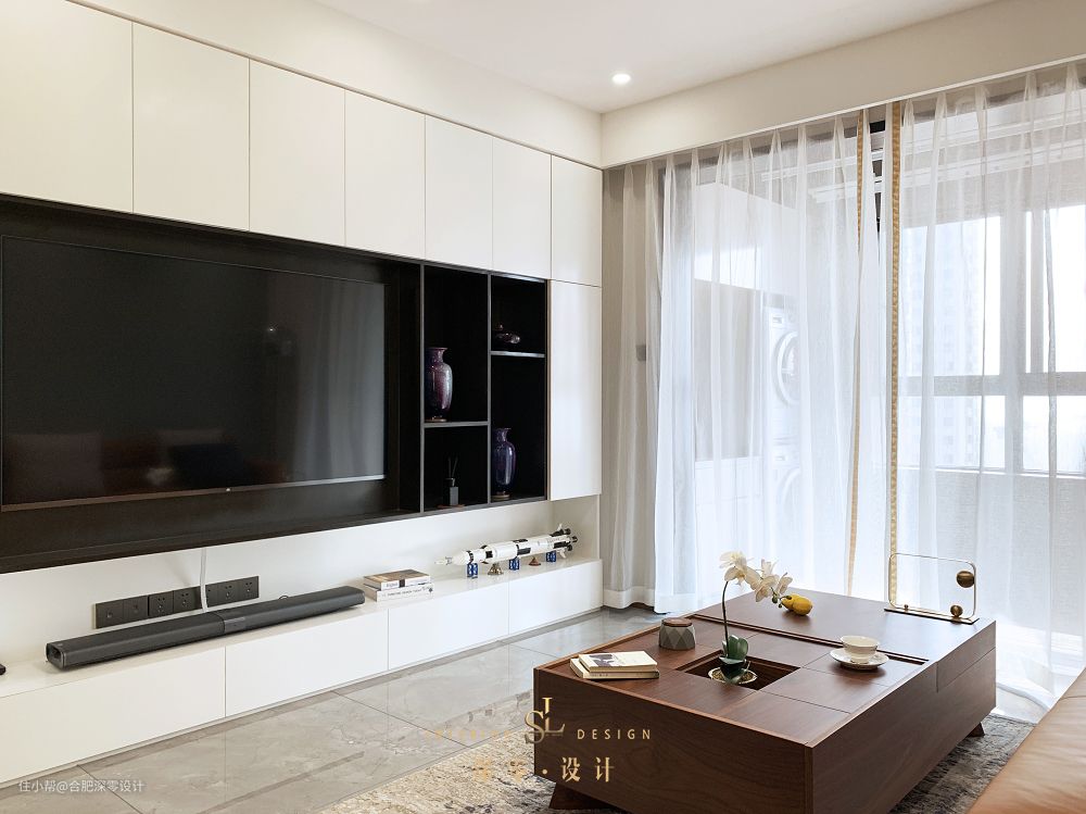 如果你家舍弃不了观影的需求,居中也就是正对餐桌的C位,可以留出来,内嵌安装电视,降低它的存在感,有点类似于以下这种设计▼