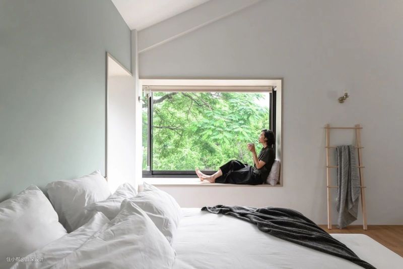 简单的处理,让房子不规则的地方变成整个屋子的亮点。不得不说,这个狭长的大窗配上飘窗,实用性、休闲感都 UP 了一个层级。