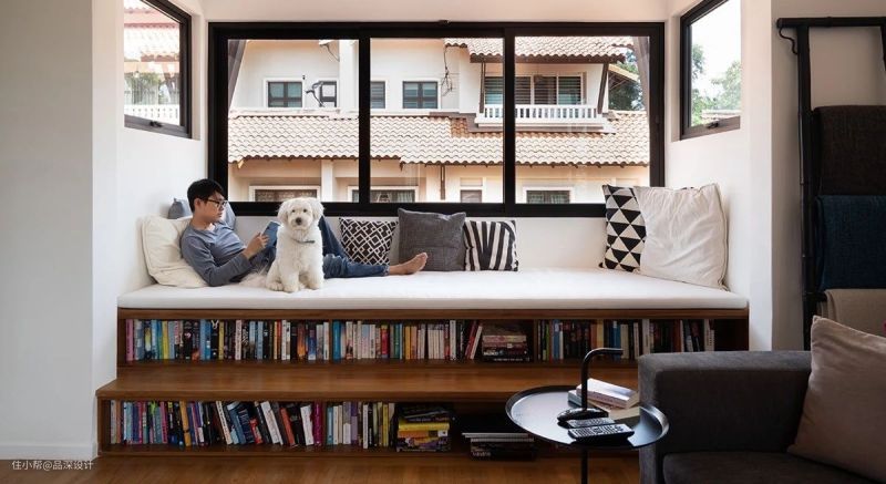 窗户太高?没关系,把书架做成台阶就 OK 了。