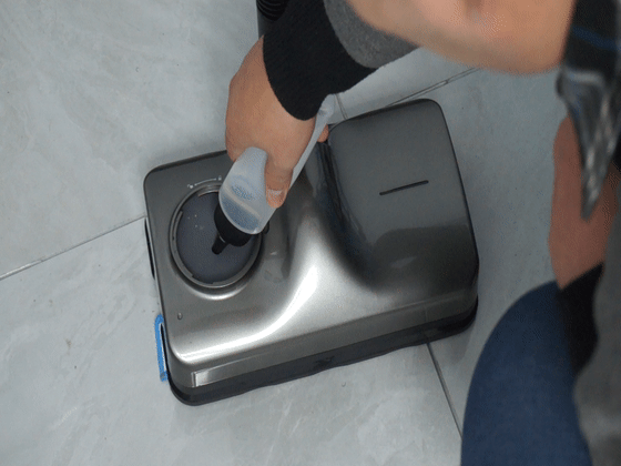 设备在使用前,需要先对内置的水箱进行注水和滴入清洁液。旋转扭开拖头上面的盖子,使用注水杯往里面注水,然后滴入两滴清洁液,用干净的纸巾擦拭下表面的水迹,旋转盖上盖子即可。