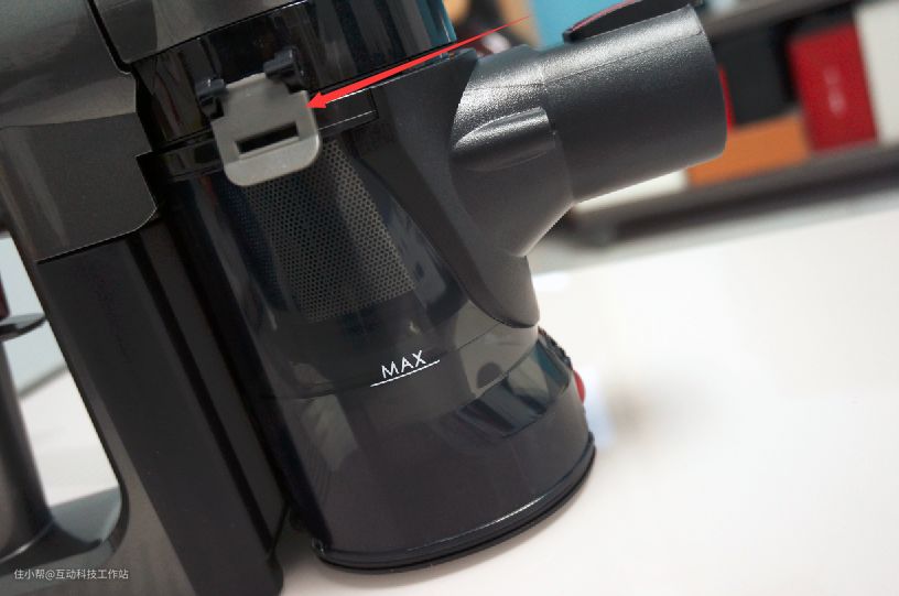 与很多吸拖一体机不可分离的设计不一样的是,洒拖F6的主机是由组装而来,也就是现在看到的主机部分仍然可以通过自由拆解的方式分离。这种设计不仅仅将电机部分和尘盒部分做了完全独立分开,而且将尘盒也做了继续分离。按压主机上方的红色卡扣可以分离主机和尘盒,按压尘盒左右两侧的卡扣则可以分离尘盖和尘杯。尘杯的容量也不小,而且也标注了最大刻度。