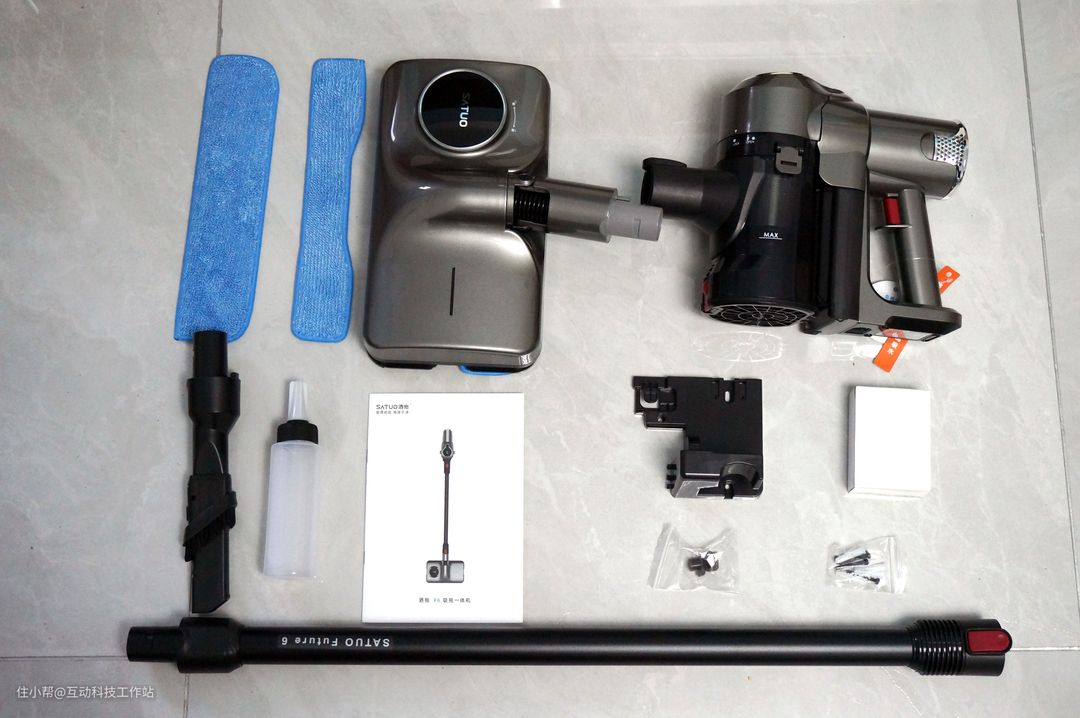 洒拖F6的核心配件就是主机部分、连接杆和地拖,其他的就是耗材和底座相关或者充电器。在此,我们先就核心部件做简单说明。
