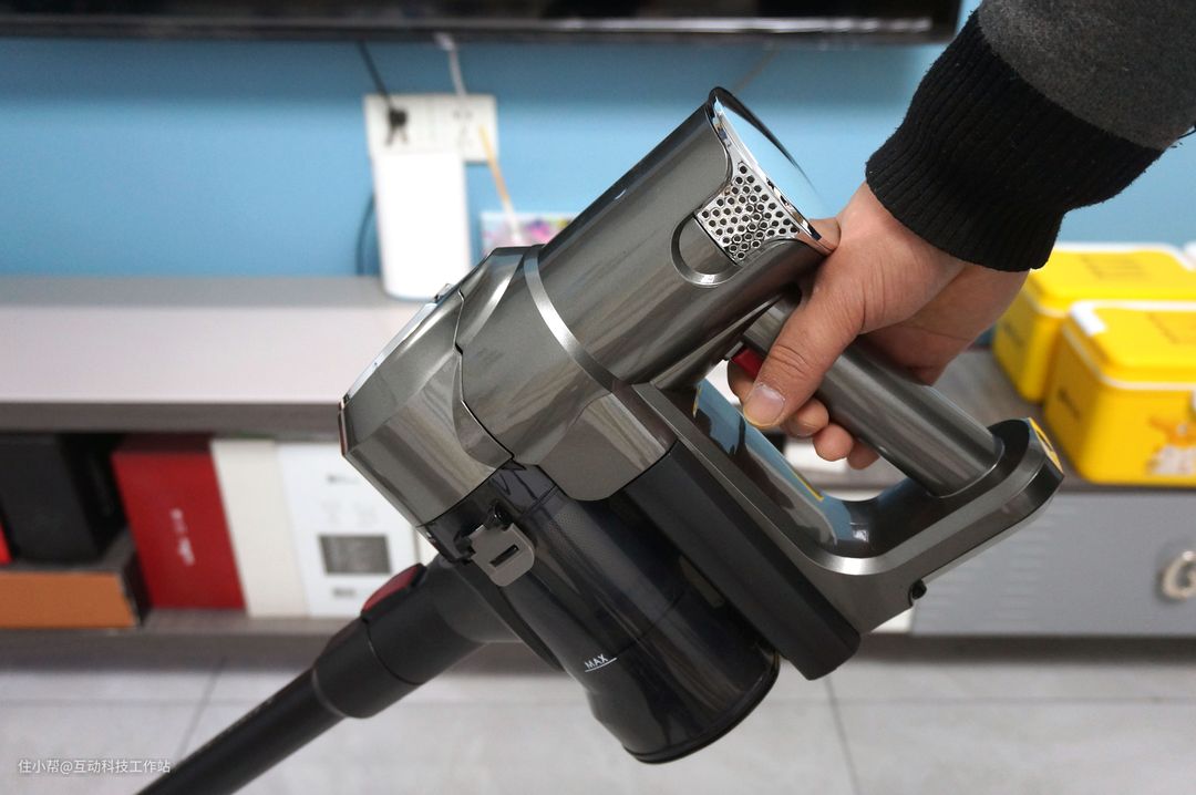 洒拖F6的使用方式非常简单,按压把手内侧的红色按键,即可打开电源开关并为一档,再次按压则为高速档;第三次按压则是关闭电源。整个握把的设计也很符合人们的使用习惯,握持的角度并不费力,不过稍微有些不好的是电源开关的位置有时候在过程中容易触碰到。我能理解洒拖这样设计的本意是为了方便开关,但是带来的容易误触碰却没有得到妥善解决,是一点小瑕疵。