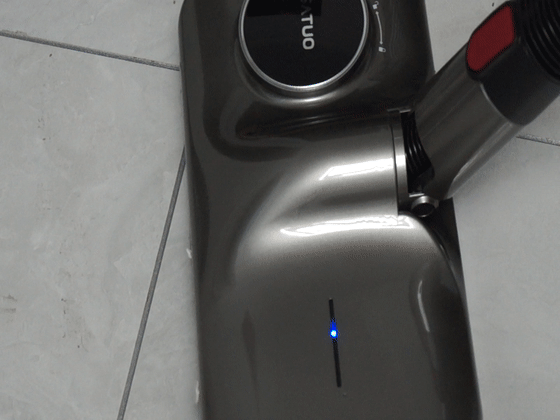 洒拖F6主机采用了岩石灰的颜色为主色调,尾部亮晶晶的地方是出风口,洒拖用了镀铬的金属罩来提升产品质感;内侧的红色按钮则是电源开关。在主机内部有一个无刷电机,额定功率为250W,有多档吸力;然后就是电池,电池的容量为2200mAh,在无线产品中算是比较大的,入手的感觉也很有分量。