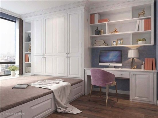 结合飘窗定制衣柜、书柜、书台、收纳柜,一体化定制解决多个生活需求。