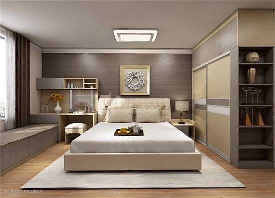 简欧式卧房定制,飘窗处看起来是一个书台,其实它翻起来可以是一个梳妆台。